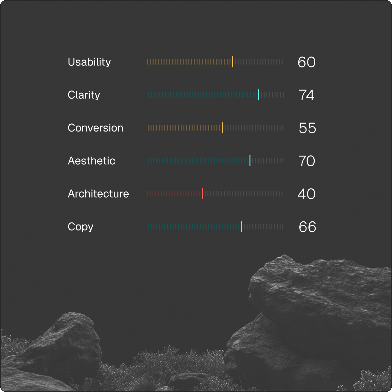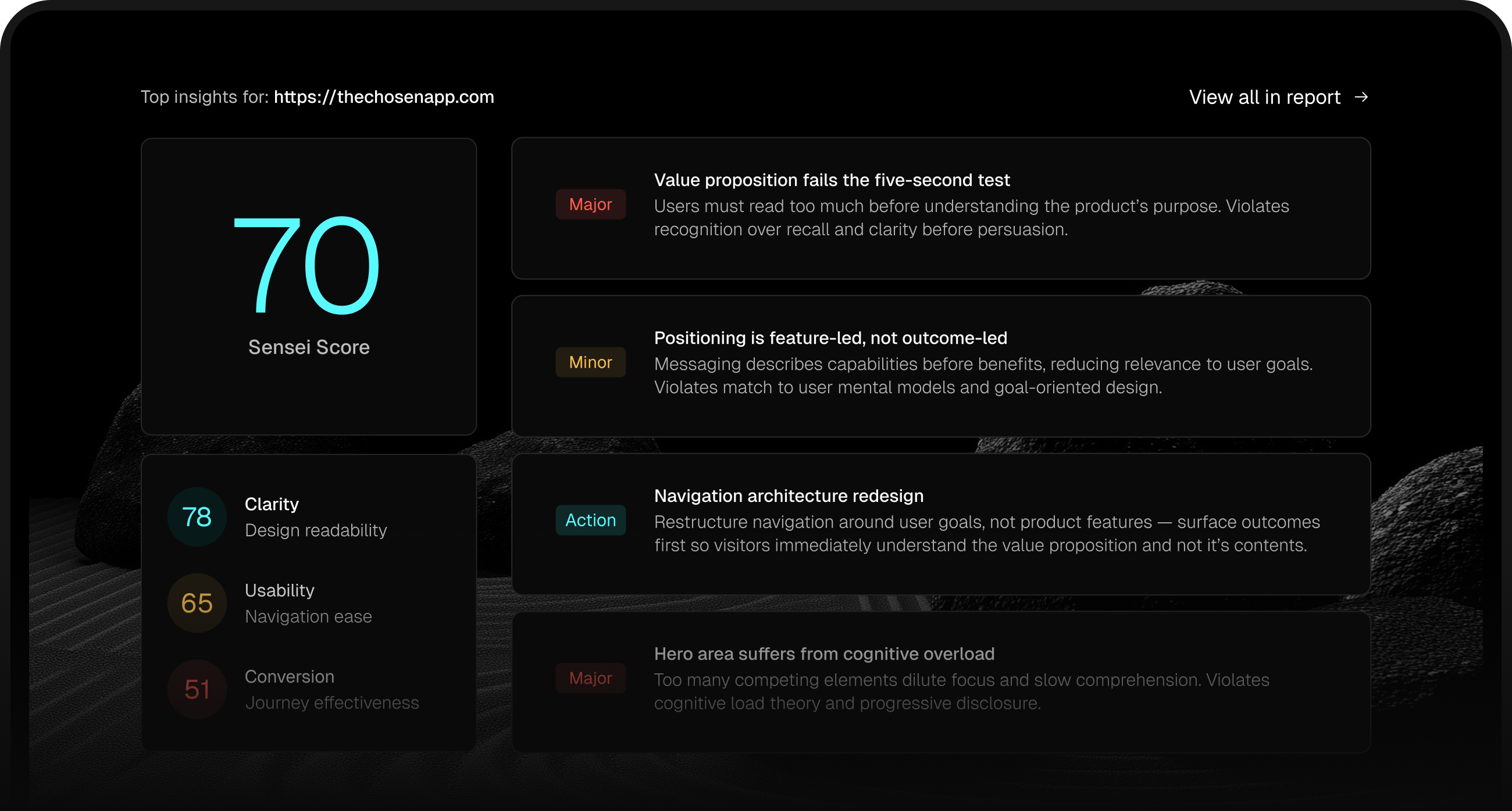 World-class UX design is now table stakes. Sensei evaluates usability, clarity, conversion, aesthetic quality, copy, and architecture through a structured design intelligence framework.